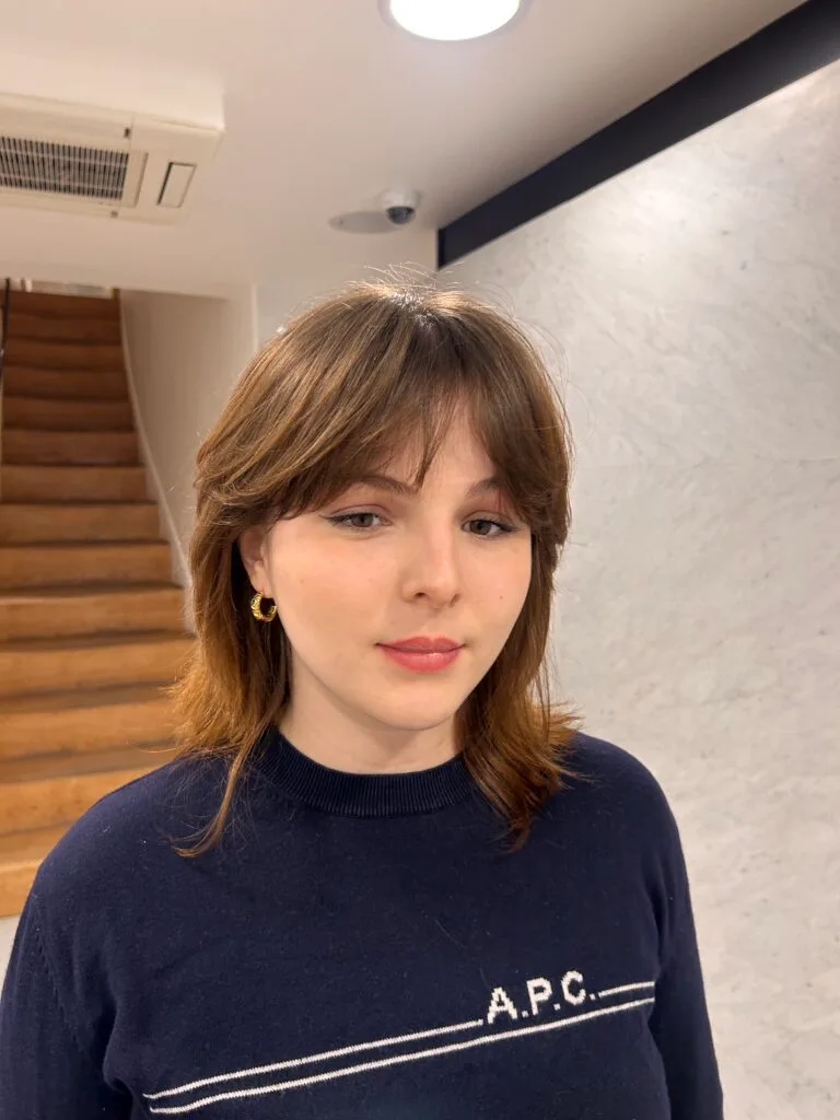> C’est une coupe avec obligatoirement une frange imposante plus ou moins courte, elle part d’un point court au milieu des yeux et part en dégradé effilé sur les côtés , le dégradé continue sur les pommettes, les jours, le cou et jusqu’au pointes.