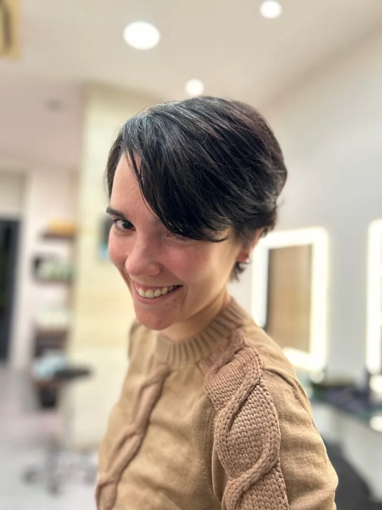Cette dernière se distingue avec des mèches légèrement plus longues sur le dessus et des côtés plus courts, pour un look edgy et moderne. Avec ou sans frange, la pixie est hyper stylée, surtout pour celles qui aiment un peu d’originalité ! »
