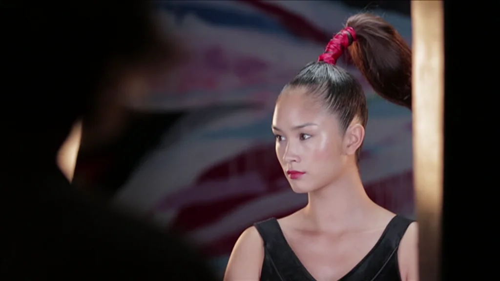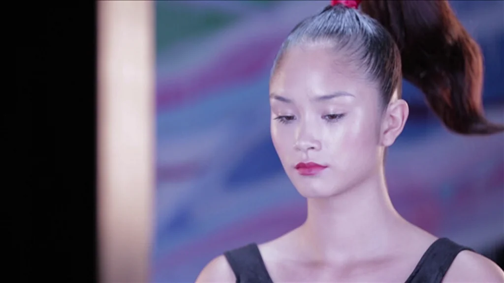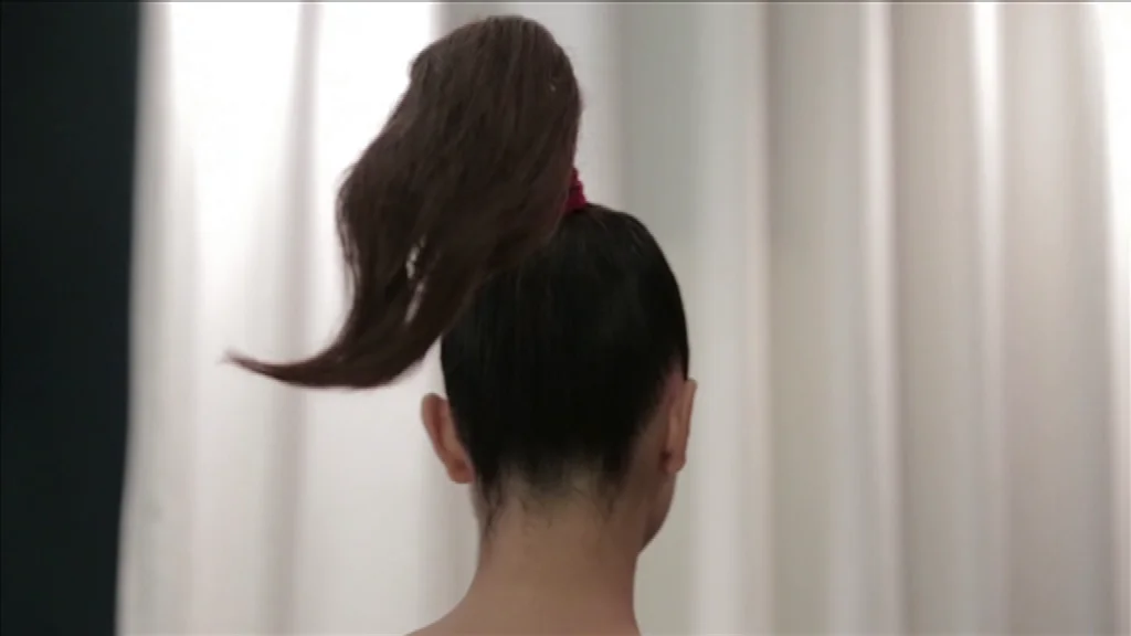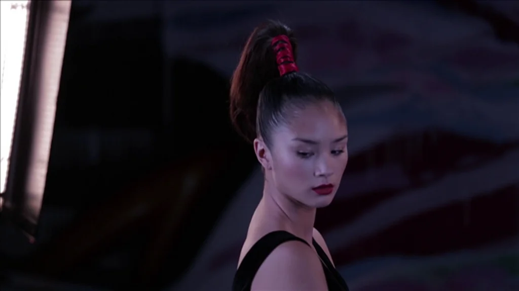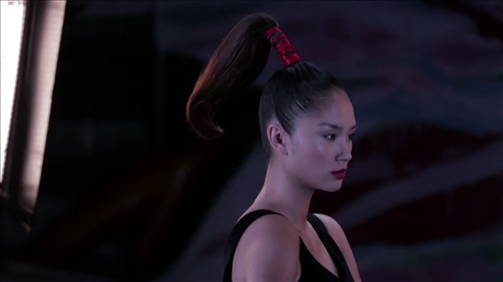 16h30, Karolina entre de nouveau sur le plateau coiffée d’une queue de cheval dressée sur le dessus de tête liée par un bandeau de cheveux rouge, inspiré des pinceau,’ japonais.